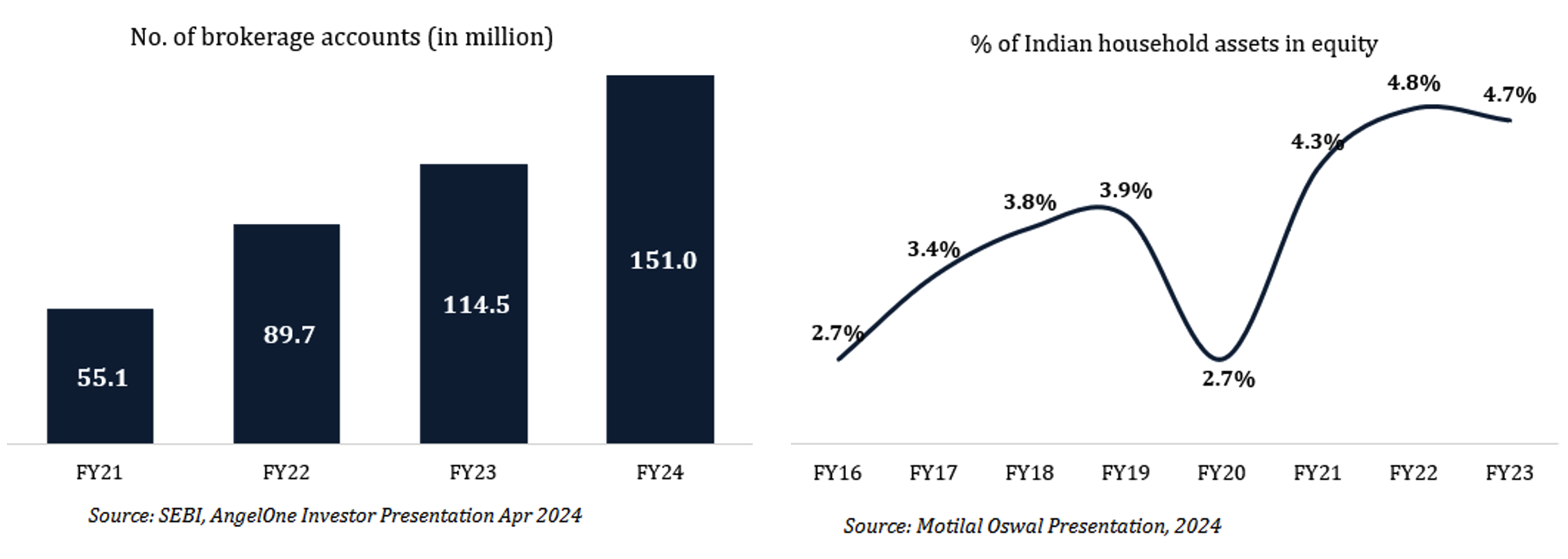 However, the biggest force to reckon with has been the retail investor. In the equity markets, this can be witnessed by the steady increase in the number of brokerage accounts opened every year, with an increase in momentum since 2020 as affluence levels continue to rise, and interest rates remain at historic lows. Financialization of savings is propelling investment in equities. With 4.7% of Indian household assets in equity, as against ~45% in USA, the Indian retail investor's increasing influence in the stock markets is just a preview of what is yet to come.