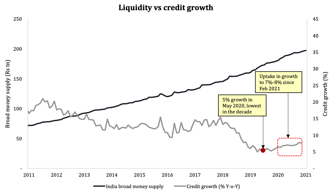 Liquidity vs. credit growth: Quantitative easing has led to a flux of liquidity into the economy, increasing consumption and investment. Since March 2020, the RBI has injected ~$59 billion of liquidity while maintaining the lowest interest rates in a decade (currently at 4.0%, down from 5.3% pre-pandemic).