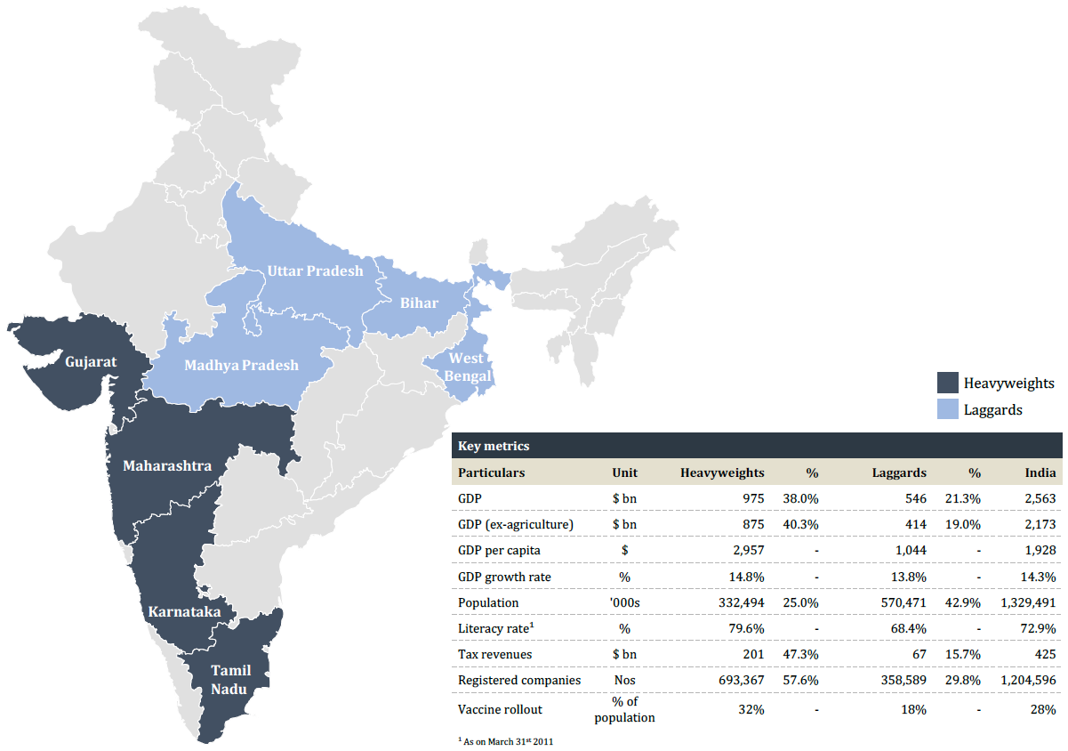 When it comes to political representation, the Heavyweights represent a mere 26% of the 543 seats in the Lok Sabha, the lower house of Parliament. Uttar Pradesh which contributes just 9% to GDP, votes 15% of seats. With the exception of Narendra Modi who is from Gujarat, most other Prime Ministers and senior Ministers in India's history have come from poorer states, re-emphasizing that politics is driven by votebanks rather than economics.