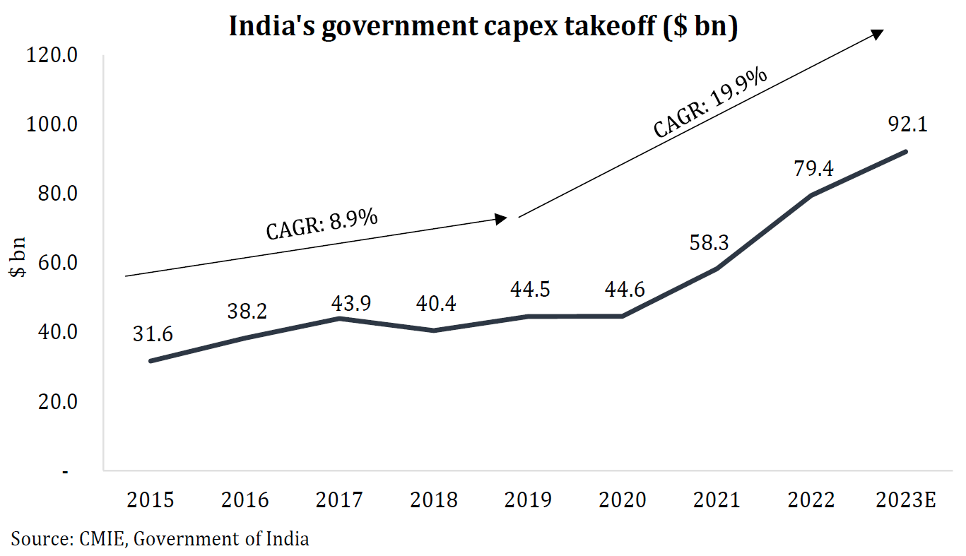 Roads, railways, and ports may not appear glamorous examples of a capex super-cycle. However, such investments are prime drivers of the Indian government's ~$92 billion capex spend for 2023 (a whopping ~192% jump from 2015). Over the last two years, India's highways authority has laid down enough roads to cover ~80% of the Earth's 40,000-kilometer circumference – making for one arduous road trip!