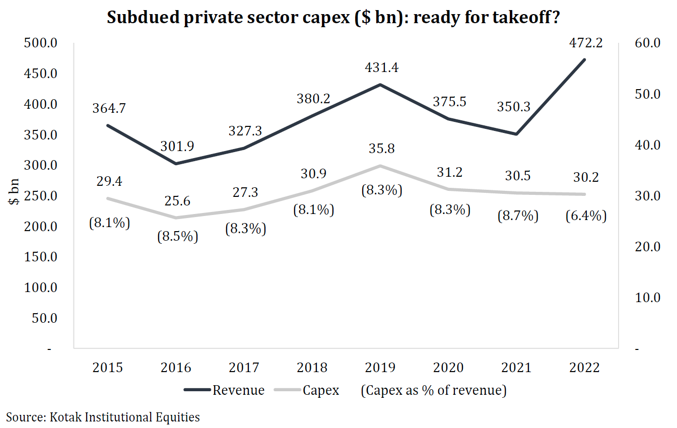 Ideally, India's private sector should be driving down the roads laid by the government. However, companies listed on the NIFTY Manufacturing Index have spent much less than the public sector on capex, leading to appeals by the government for the private sector to increase spending. While private sector capex has stayed somewhat consistent at ~8% of revenues, the scale of mega project announcements in recent times bodes well for a surge in spending in the coming years.