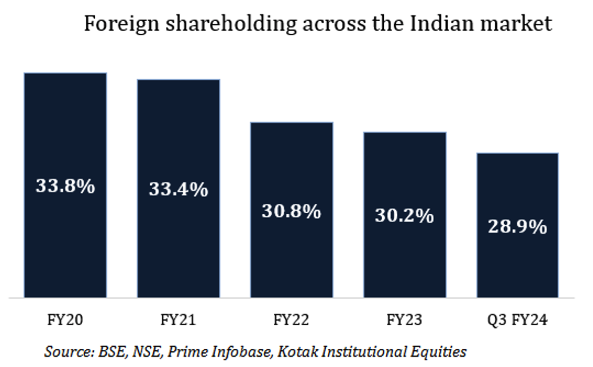 1 The chart on foreign shareholding across the Indian market includes shareholding by foreign controlling shareholders as well as institutional investors